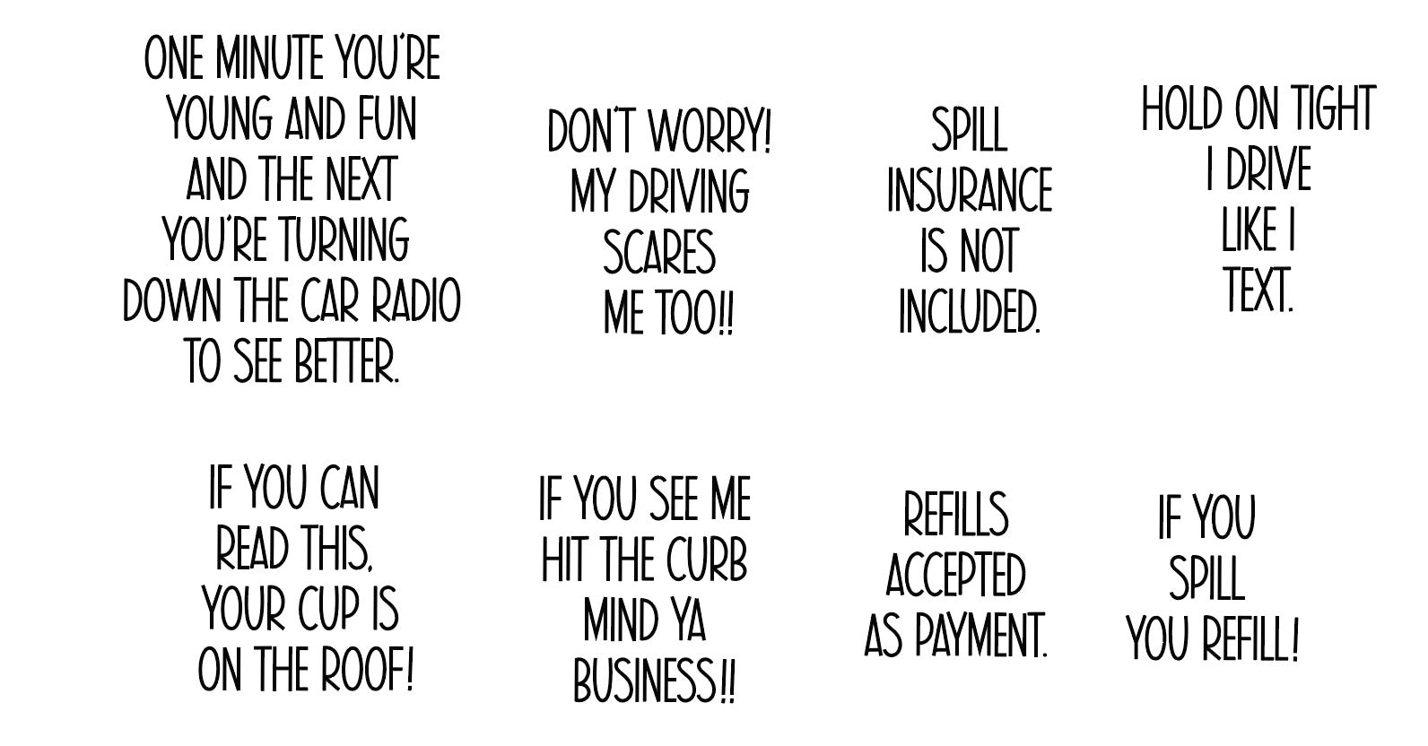 Upgrade your cup holders with these stylish and functional car coasters! Made from your choice of wood & cork or ceramic, they absorb moisture and protect your car from spills and stains. Each set includes two coasters featuring funny sayings to add a touch of humor to your ride. Makes a great gift!