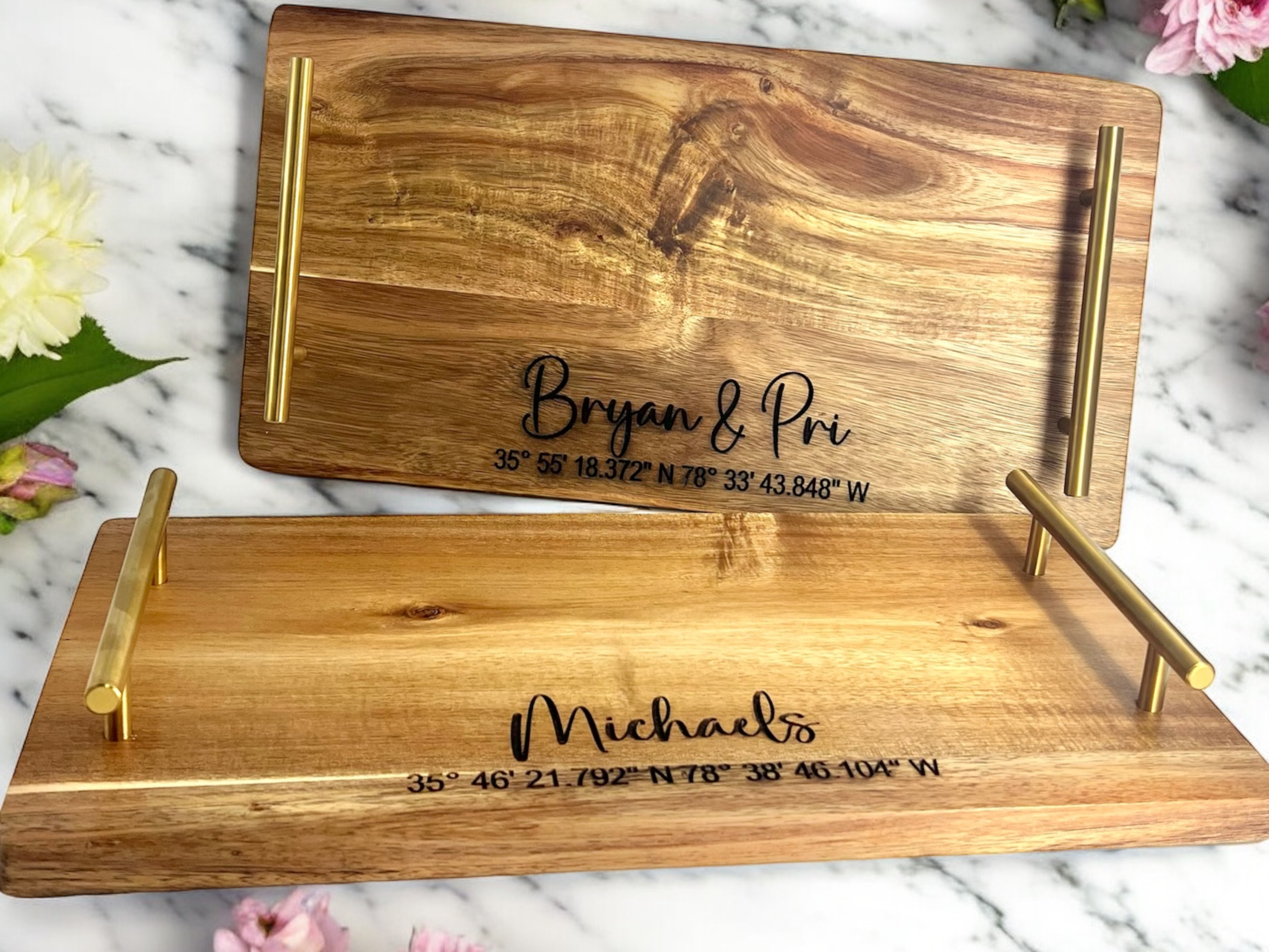 Elevate your home decor and entertaining with our Custom Handled Acacia Tray, beautifully engraved to create a unique and personal touch. Crafted from premium acacia wood, this elegant serving tray features sturdy handles for effortless carrying, making it both functional and stylish.