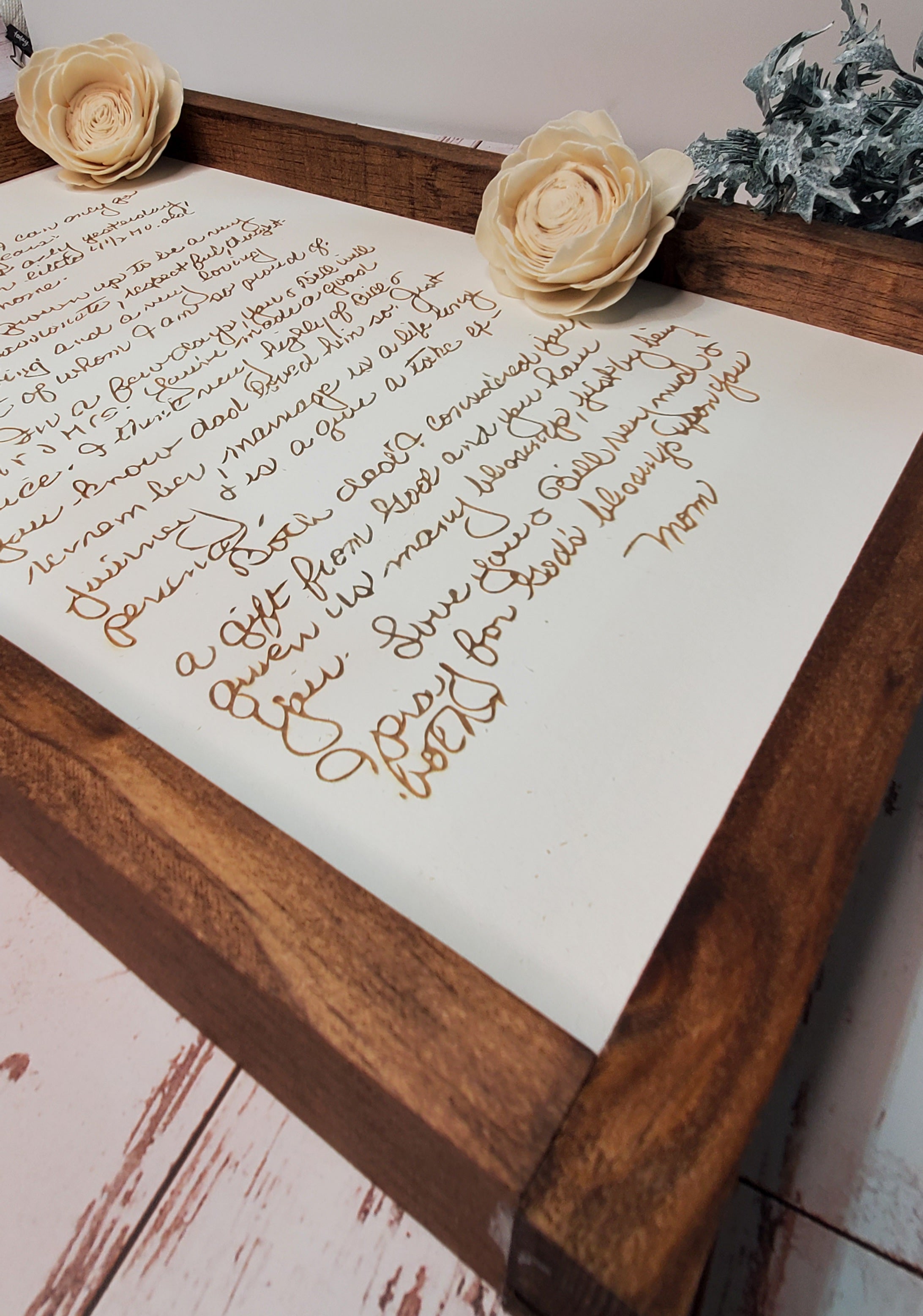 Preserve a special memory forever. This is a 12x18 farmhouse framed sign. The large size is good for letters, detailed recipes, etc.