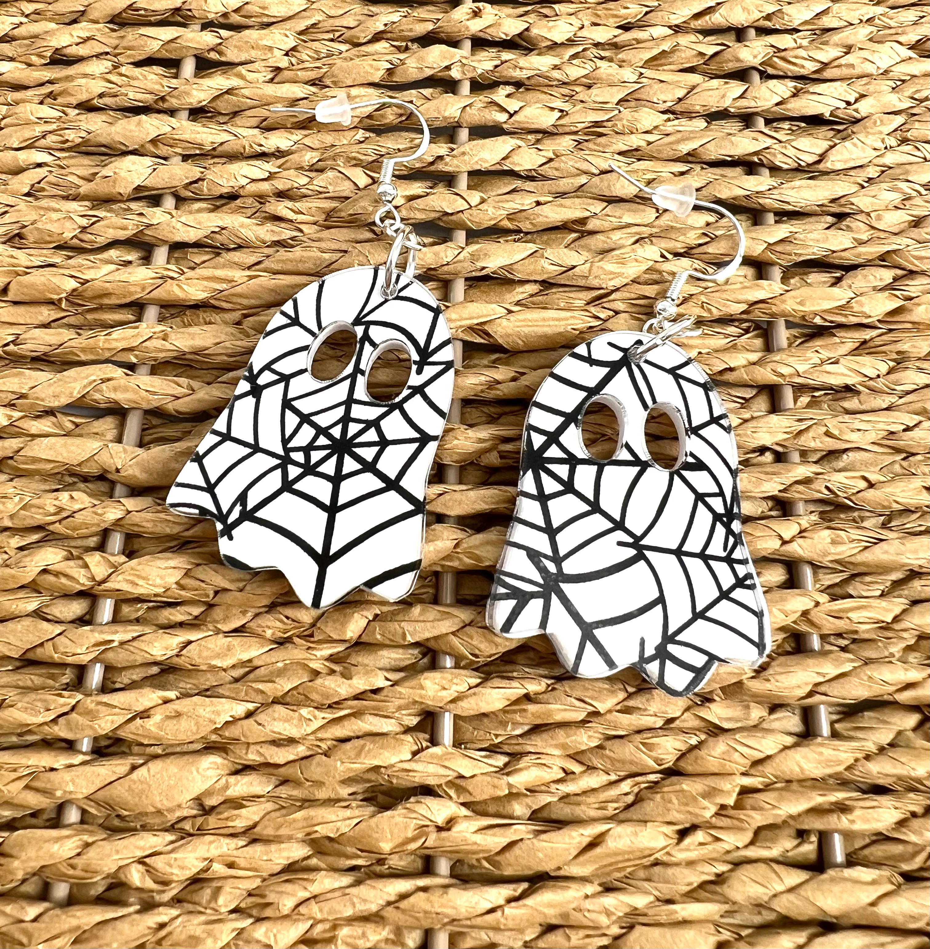 Look cute and make a spooky fashion statement with these Ghost Earrings! The dangle earrings feature a charming, playful ghost design that's sure to catch people's attention. White base with a clear 1/16th spiderweb overlay, sure to make a statement! Show off your unique style with these cute earrings!