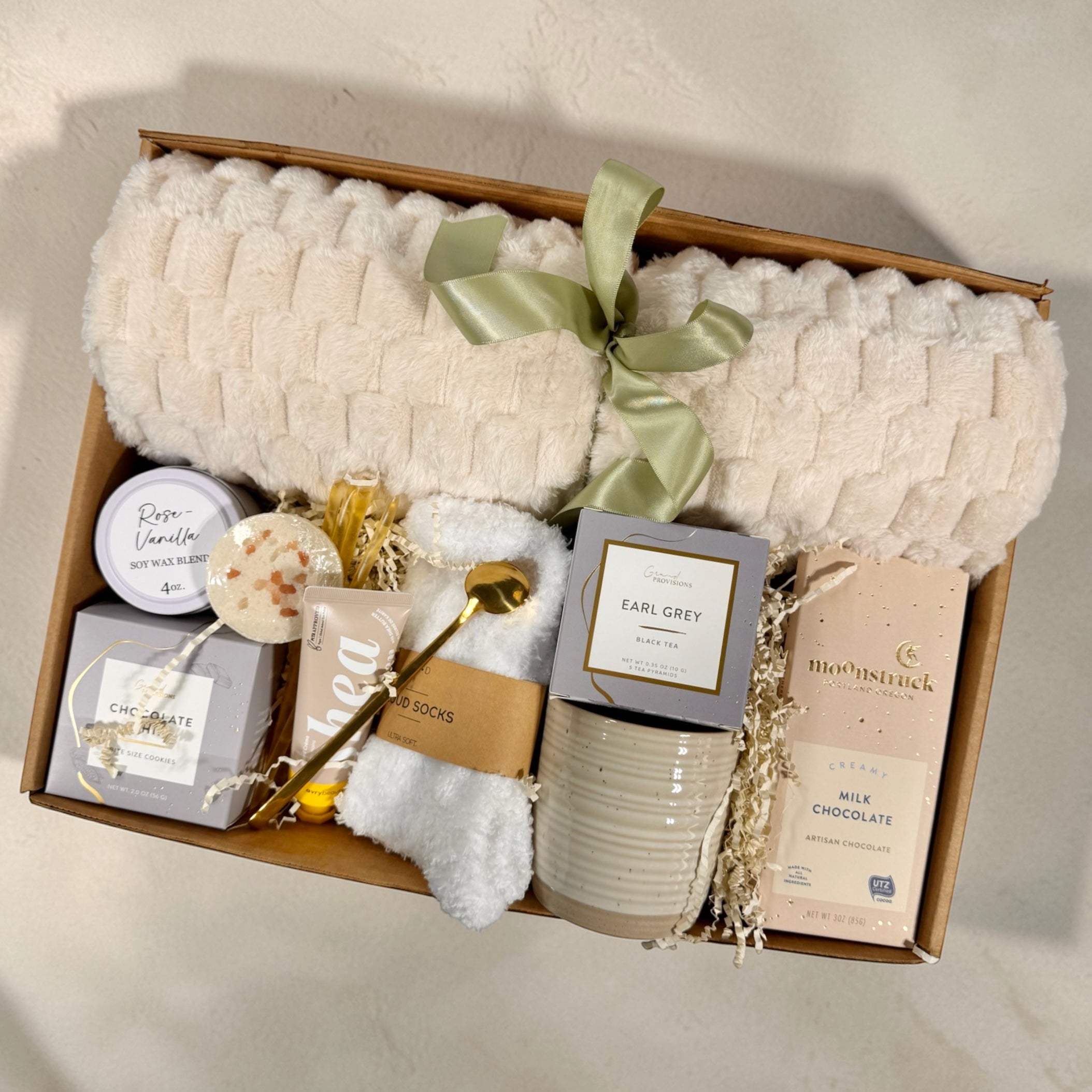 At the heart of this gift is a plush ultra-soft blanket, perfect for cozy evenings, reading time, or curling up with a warm cup of tea. Paired with comforting treats and relaxing self-care items, this gift box creates the perfect moment of calm and comfort.
