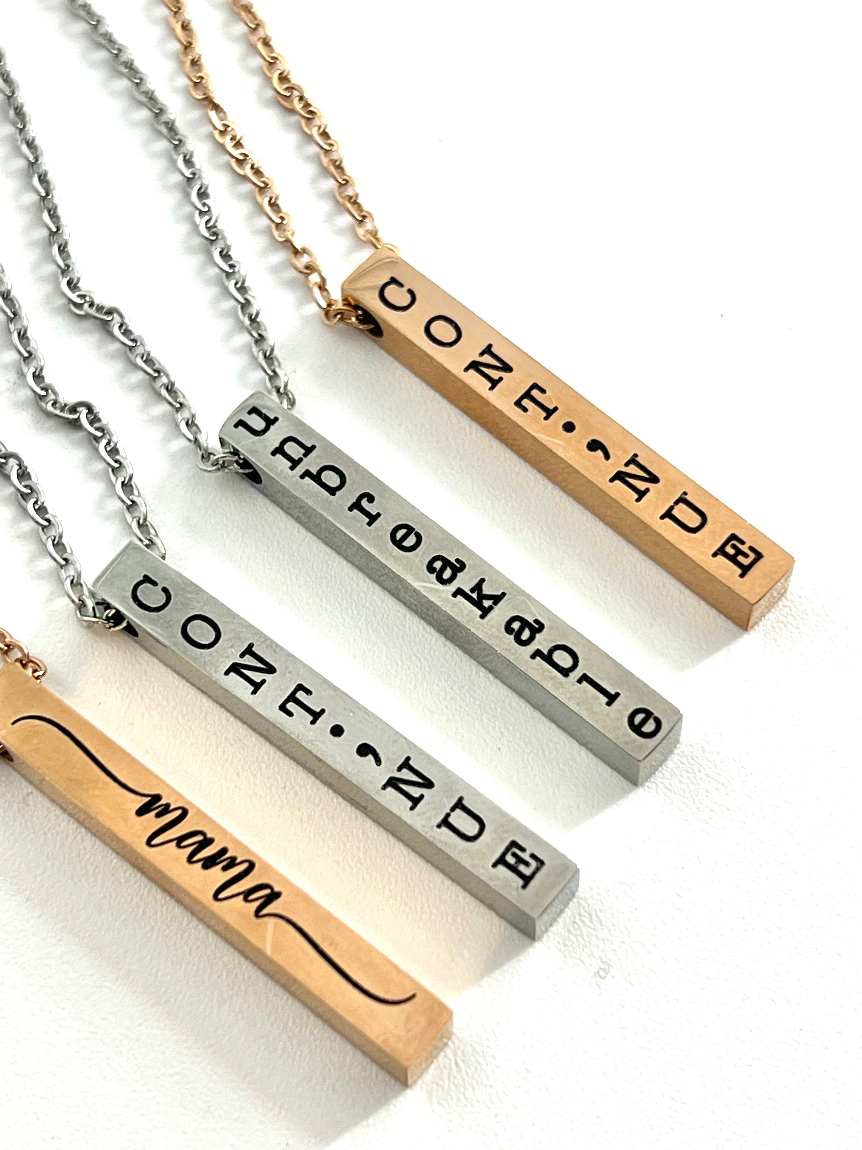 Elevate your style with our Vertical Bar Saying Necklace. Crafted from durable stainless steel, the elegant vertical bar hangs from an 17.5" necklace, serving as a subtle yet eye-catching statement piece. Perfect for any occasion, this necklace exudes sophistication and exclusivity.