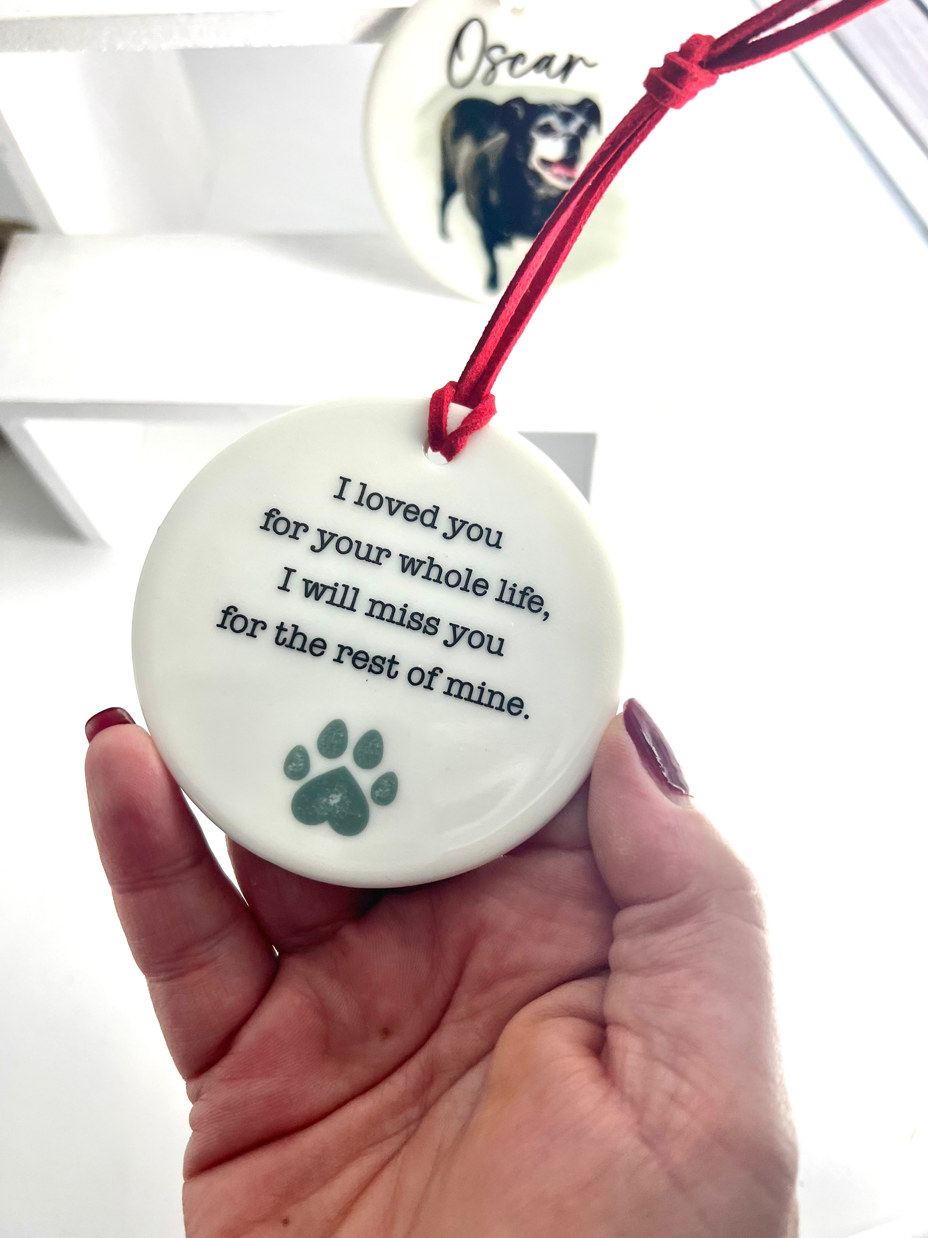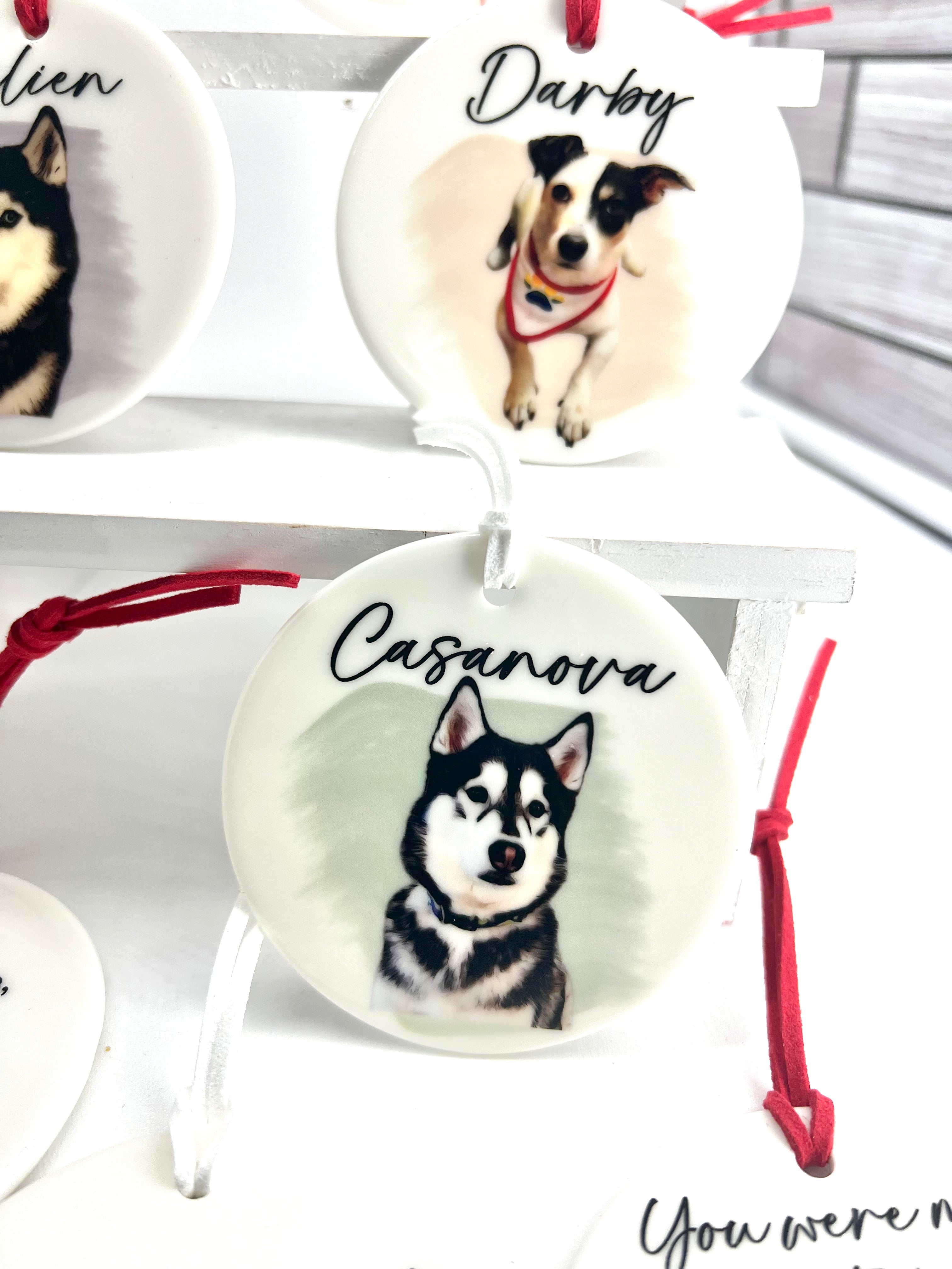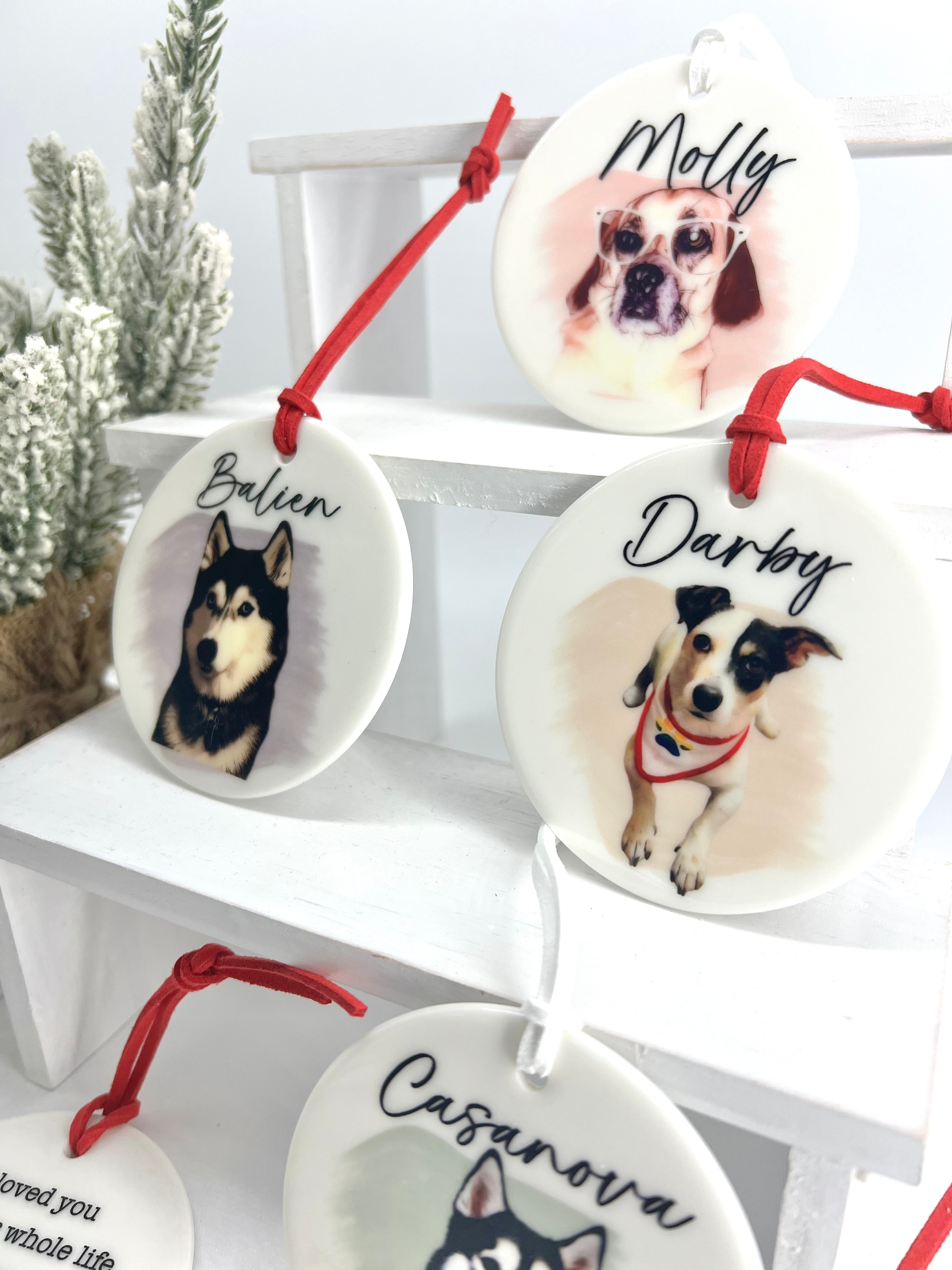 Honor your beloved pet with our Water Color Memorial Pet Ornament. Made of double sided ceramic, featuring a beautiful watercolor print of your pet and six touching sayings to choose from. Available in four background colors.(you can also choose no background and the photo will not have a watercolor stroke behind it.)