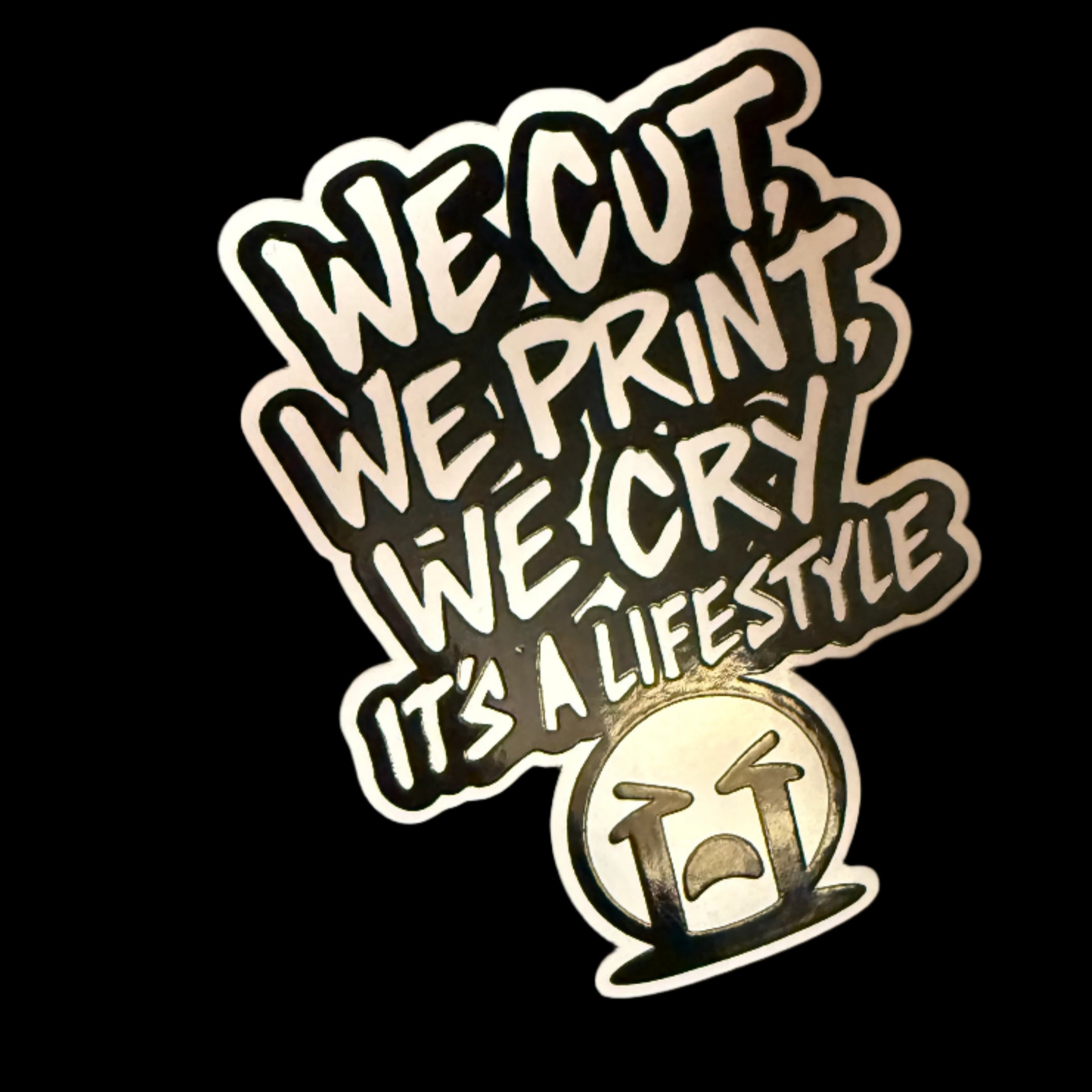 We Cut, We Print, We Cry, Its A Lifestyle Sticker (White or Holographic Options)